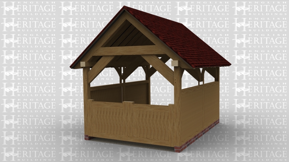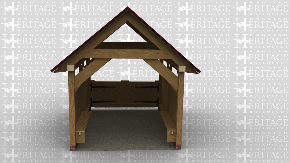 A 2 bay Oak framed boat house open at one end and at the other is a pair of doors.