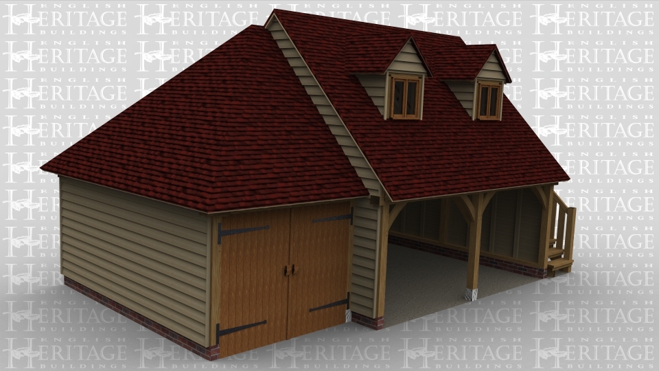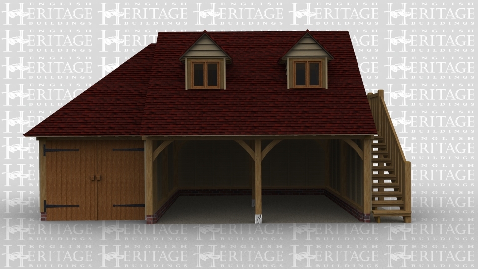 An oak framed garage. Bottom floor has two open parking bays and one smaller enclosed one which could be used for a car or storage which has a set of barn doors. An external staircase leads to the upstairs which has two dormer windows.