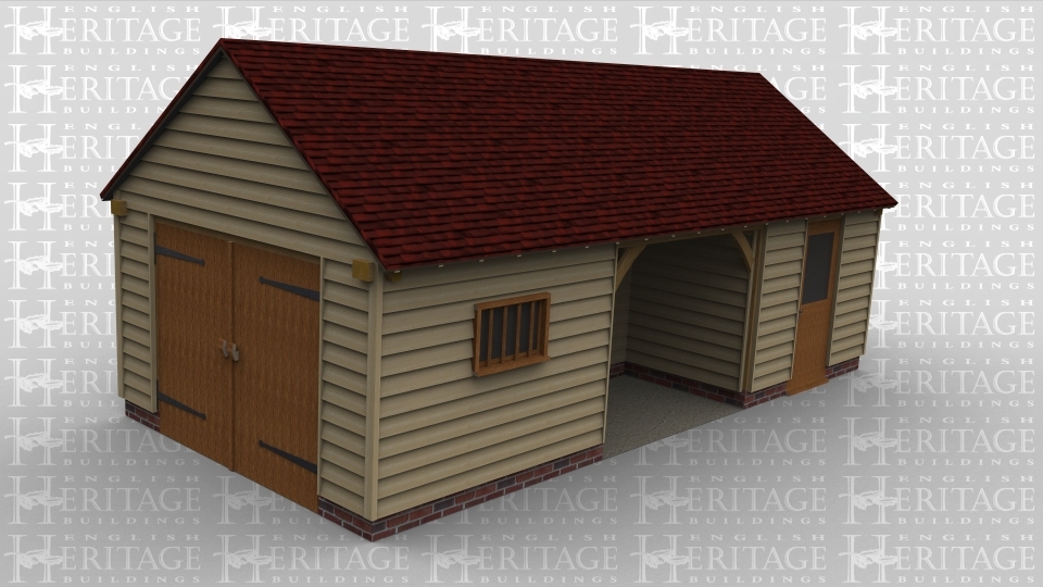An oak framed workshop / storeage. One end has a set of barn doors whilst the other uses a single door, in the centre is a shelterd space to the front leading to a storage area. Single windows are used in both buildings.