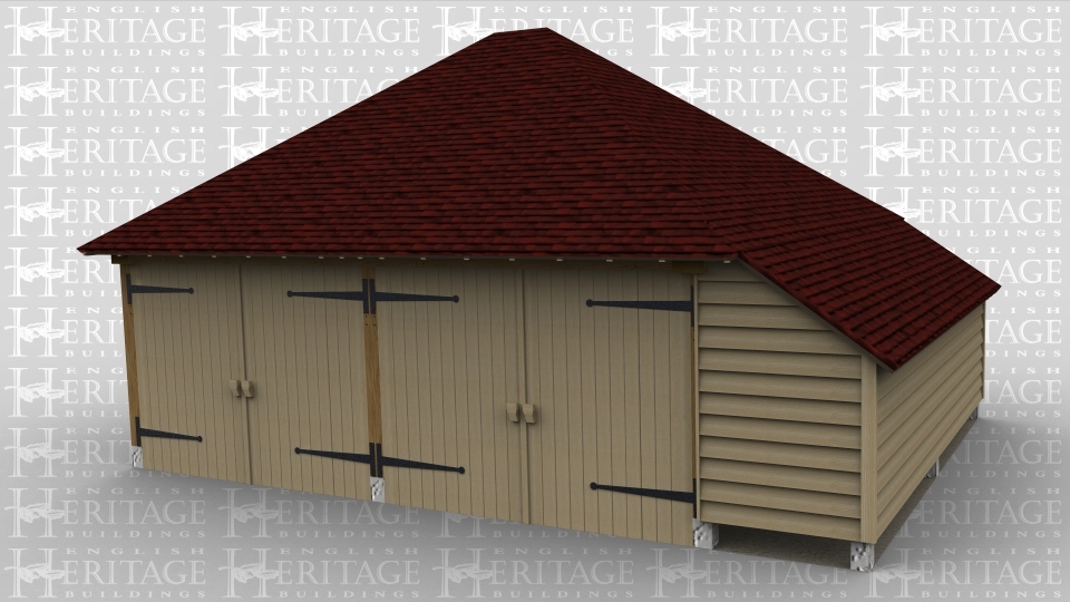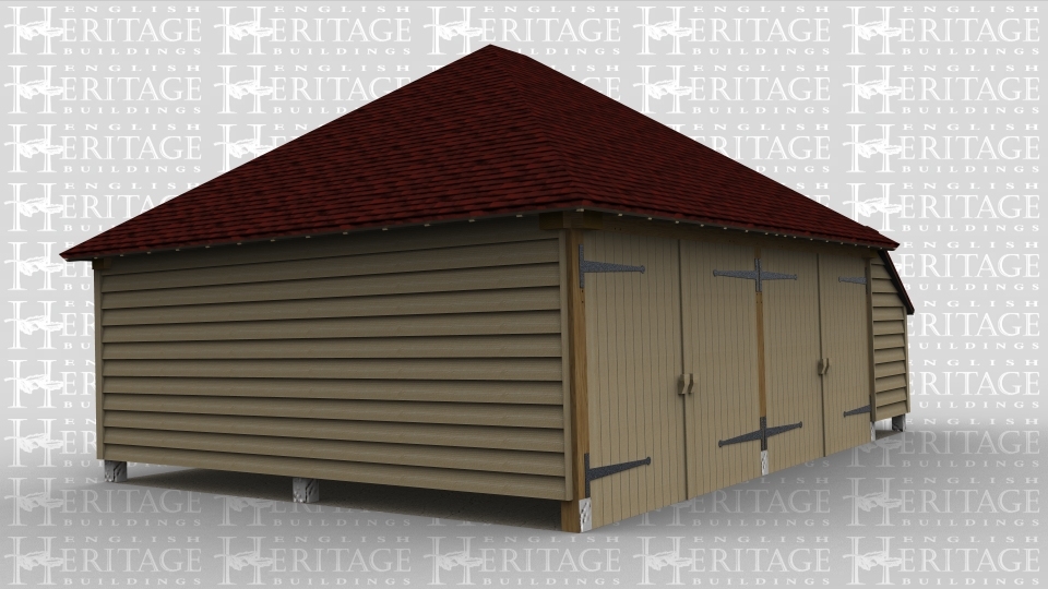 An oak framed garage with two bays enclosed by two sets of barn doors.This garage sits on staddle stones rather than a plinth wall.