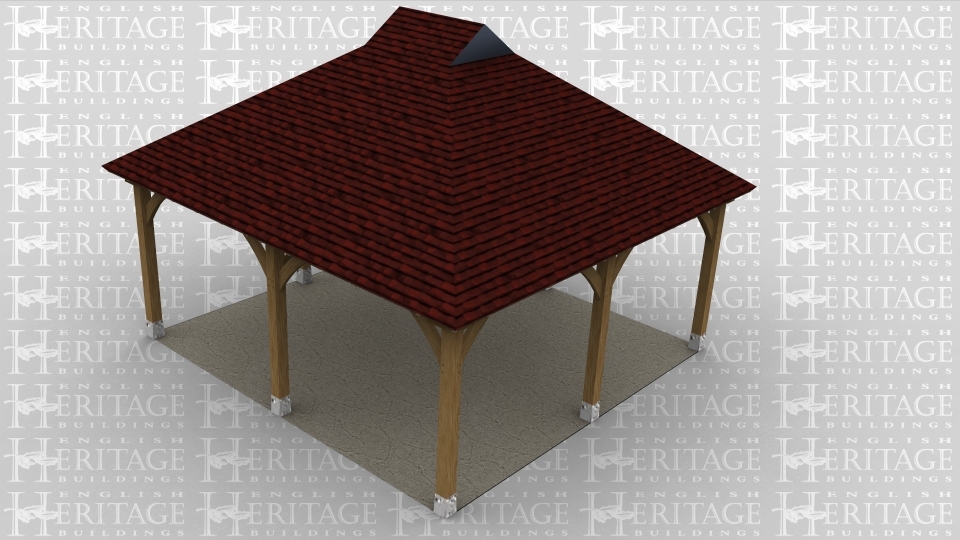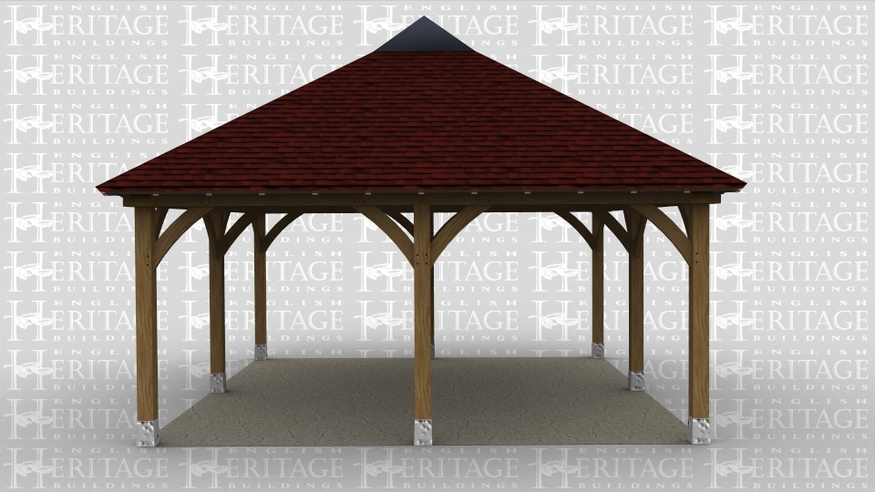 A two bay oak framed gazebo open all sides with gablets on the roof.