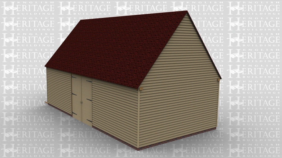 A large traditional oak frame barn building with one set of barn doors.