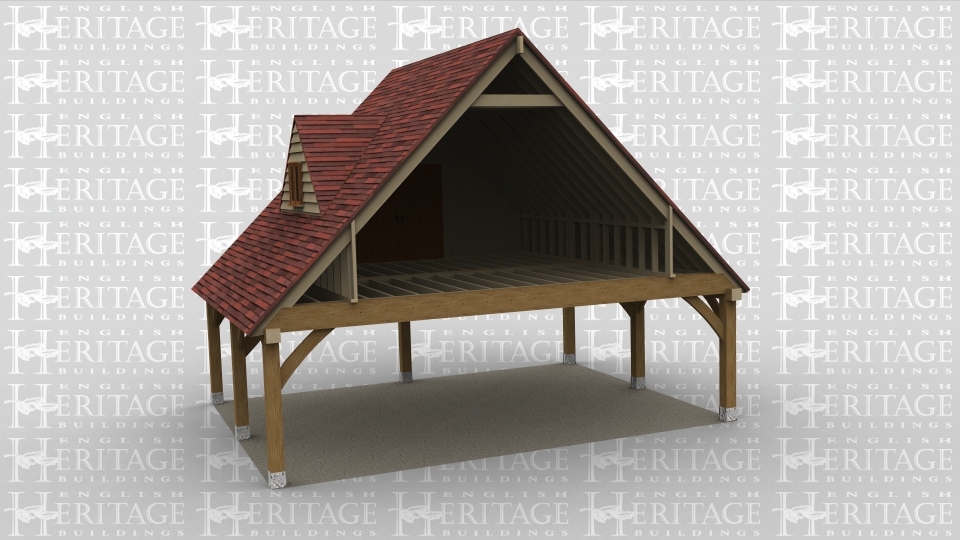 An oak frame home extension with the ground floor completely open and the first floor has a dormer window and a large barn door.