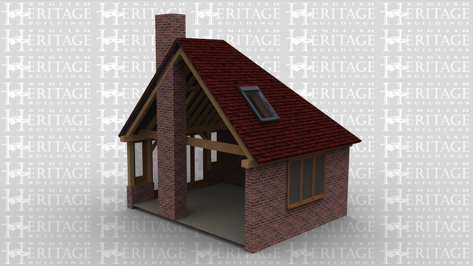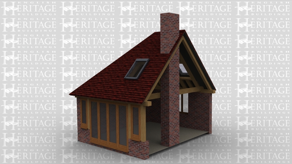 An oak frame home extension with full height glazing on one side and 2 smaller windows on another, this extension also contains a chimney