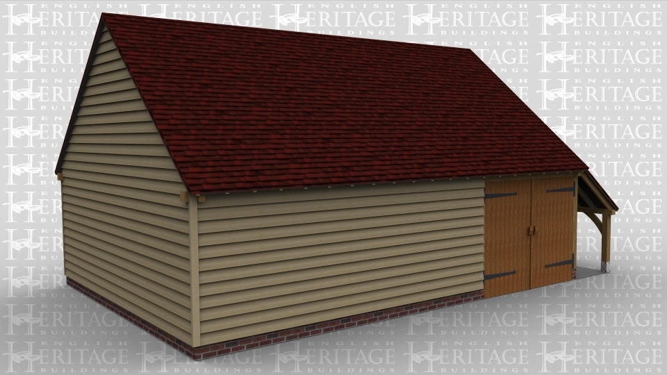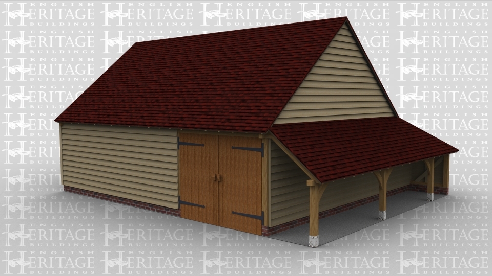 An oak frame garden room with garage and storage space. barn doors at the front, to the right there is an aisle on the side. The other side of the building has full height glazing down one side.