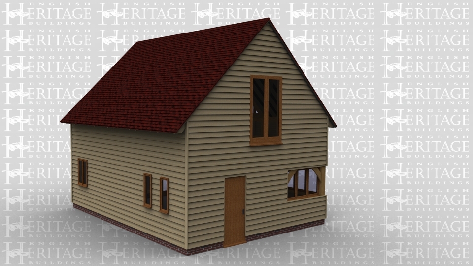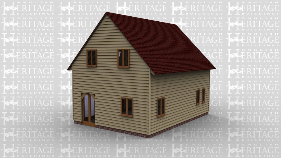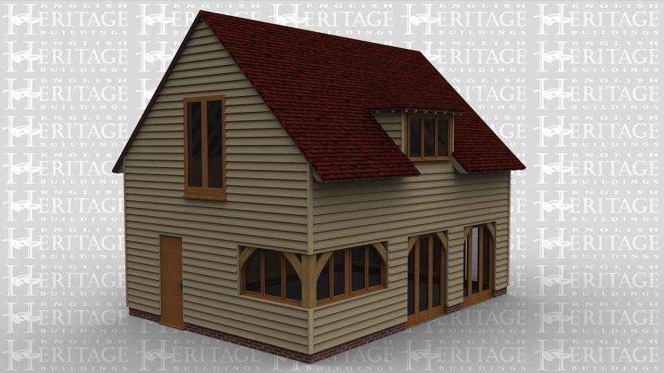 An oak framed house with full height glazing on 2 sides as well as several smaller windows on the lower floor. On the upper floor there is another window with full height glazing and also a dormer window on the front of the building.