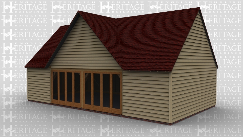 A 4 bay detached oak frame home extension with 2 full height glazed doors to allow lots of natural light in. The front of this building has a feature roof gable which creates an open vaulted roof space inside.