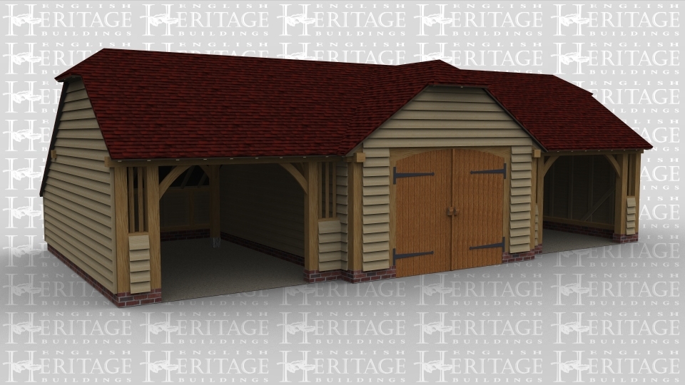 A 3 bay oak frame garage with an enclosed bay in the centre complete with barn doors and either side there is an open bay. The centre bay projects out and the ridge line runs front to rear which adds more character to the building.