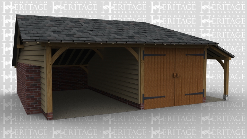 An oak frame garage with 2 bays split into an open area and an enclosed one with barn doors. This building has a low pitched roof and an aisle down the right hand side.