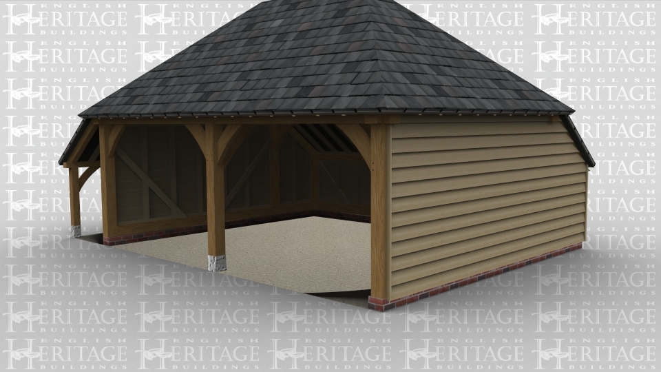 An oak frame 2 bay open ended garage with a slate roof as well as an outside log store.