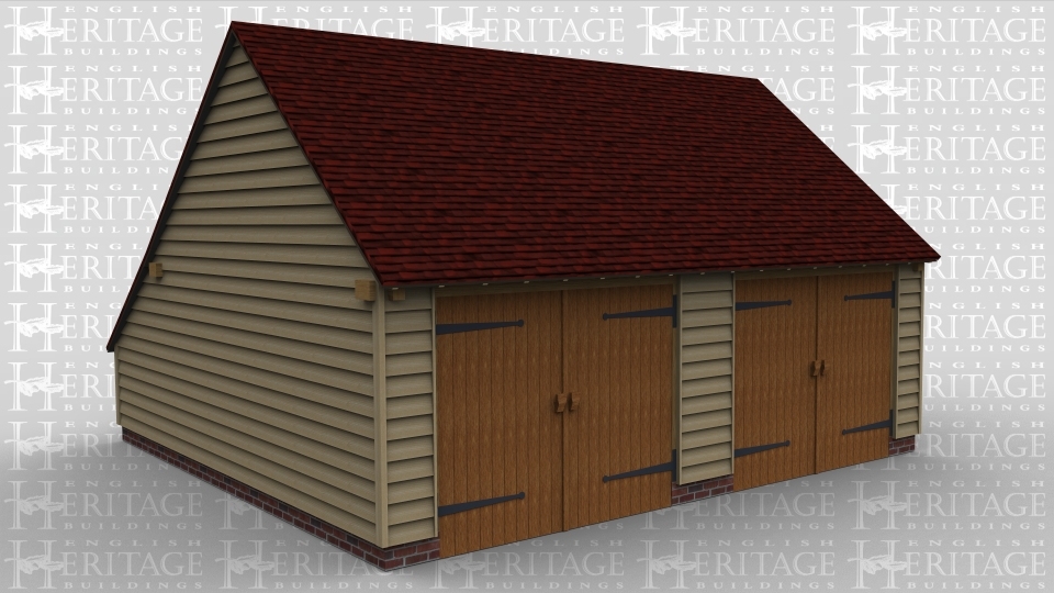 A 2 bay oak frame garage with a pair of garage doors at the front of each bay and personel door to the right wal, this building also has an enclosed aisle at the rear.