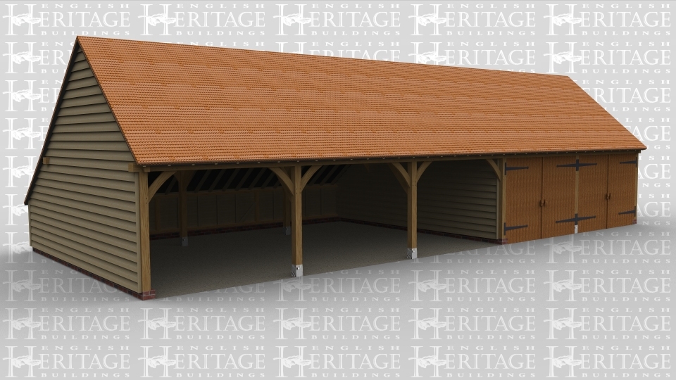 A 5 bay oak frame garage with 3 bays open at the front while the other 2 bays are enclosed with iroko garage doors, the right of the building have a 4light window and the roof is tiled with pantines.