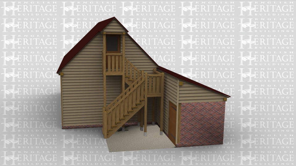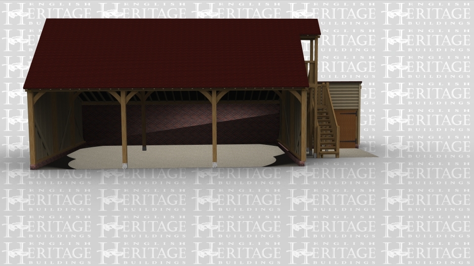 A 4 bay comercial building made up of 2 frames. The first frame has 3 bays on the ground floor and it also has an upper floor. The ground floor bays are all open at the front with a brick wall to the rear, on the right of the building is a large external oak staircase leading to the first floor. On the first floor is a pergola on the right above a half glazed door. The second frame makes up a single bay with brick walls on both the right and the rear. The frame is monopitch and has a solid single door at the front.