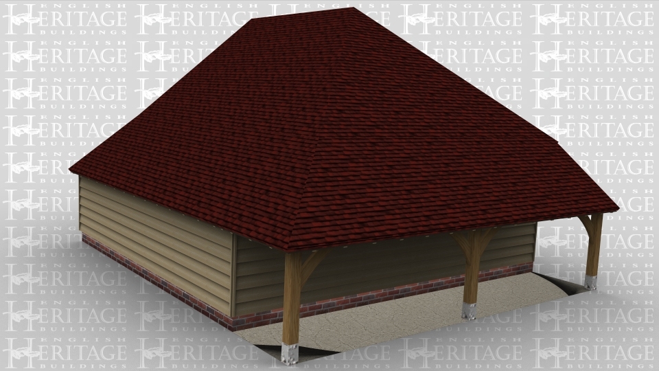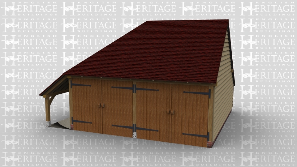 A two bay oak framed garage with two iroko garage doors at the front, this building also has an external aisle on the left side of the building.