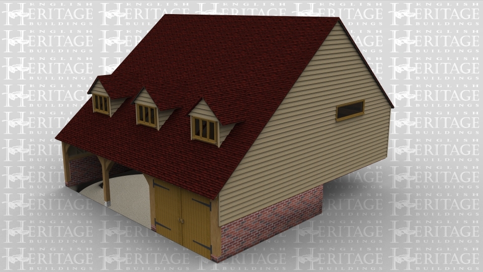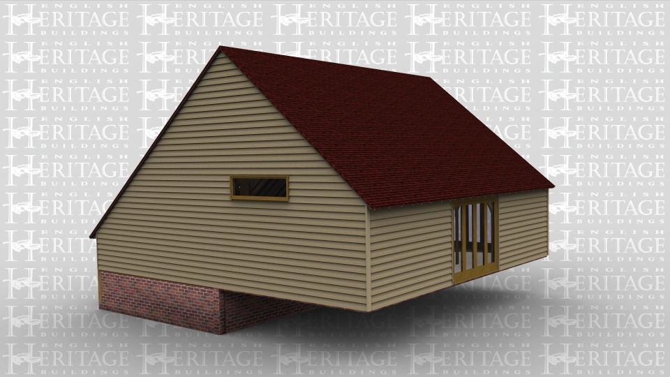 A 6 bay oak framed house on a split level. The ground floor has 3 bays at the front dedicated to a garage area, one of the bays has a pair of iroko garage doors at the front while the other two bays are left open. the ground floor of the left of the building has a three light window as well as four panes of full height glazing, the rear of the building also has full height glazed doors to allow access out of the rear of the building, these also allow lots of natural light into the building. The first floor has three dormer windows on the front of the building to provide light to the first floor as well as full height glazing on the left of the building.