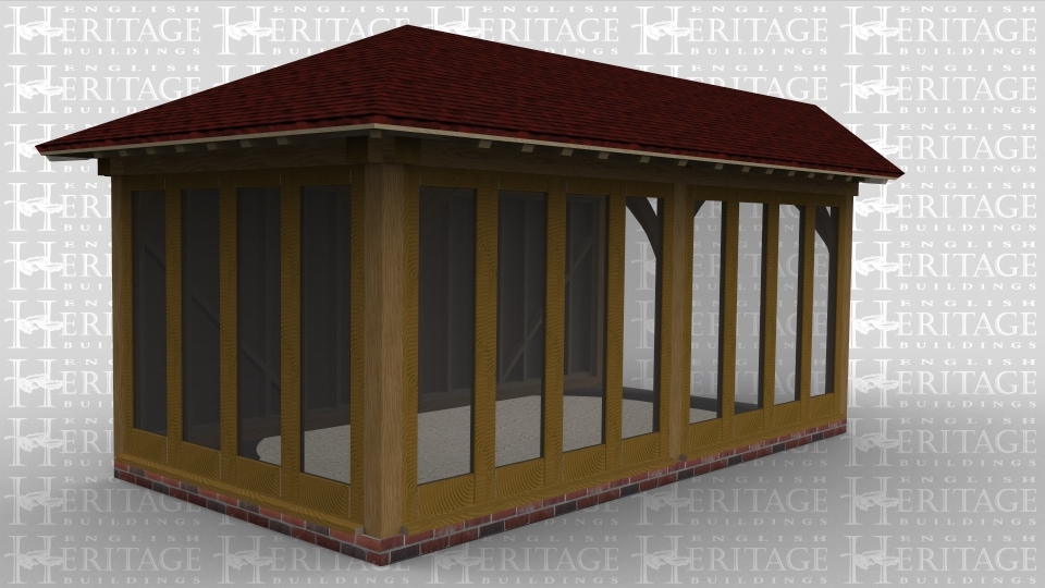 A two bay oak framed home extension with full height glazing along two sides, while one side is left open to allow for it to attach to an existing building