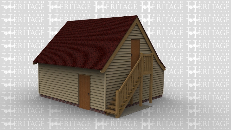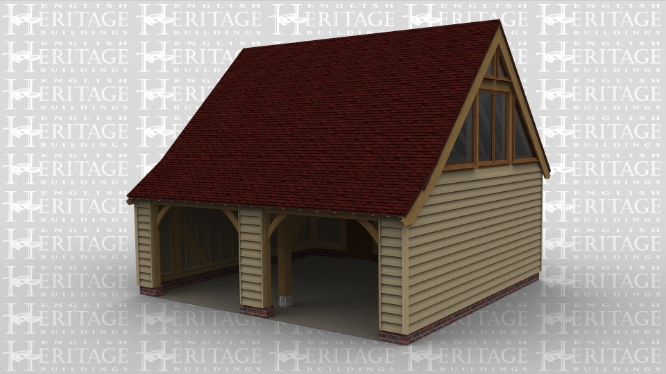 A 2 bay oak framed garage with an upper floor. On the ground floor the two bays are open at the front with a partition in the middle, at the rear is a solid single door and on the left is an external staircase which leads to the first floor. On the first floor is a solid single door on the left, on the right there is a window filling the gable end of the roof to allow plenty of natural light into the room.