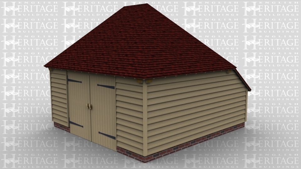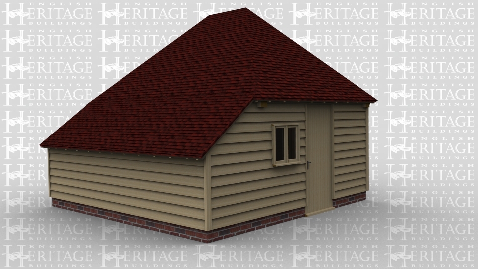 A single oak framed garage / workshop with garage doors on the front as well as a single door and a 2 light window on the left. The rear of this building also has an enclosed aisle.