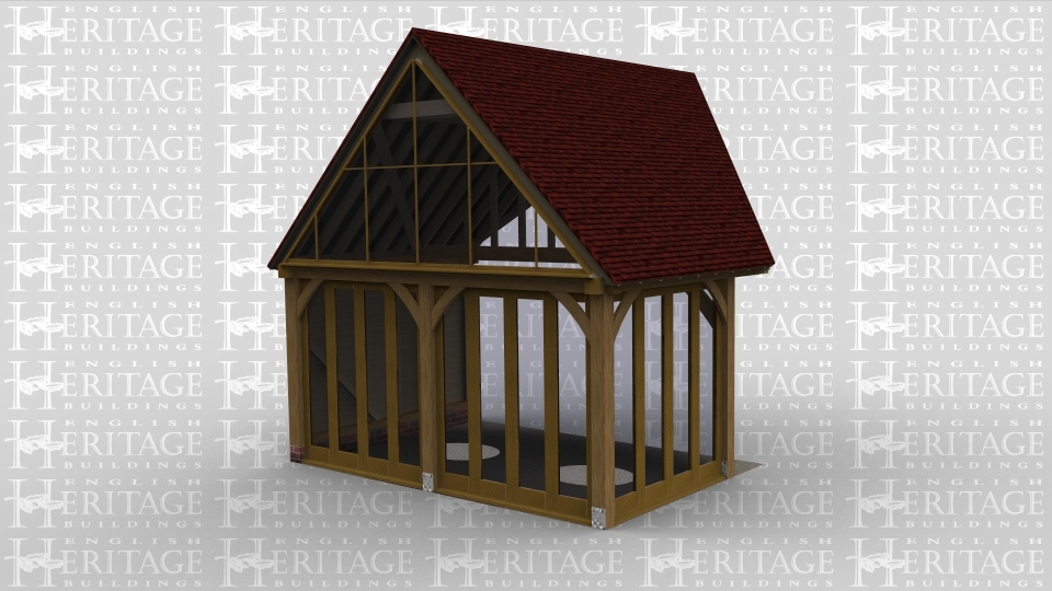 A single bay oak frame home extension with full height glazing all around three of the walls to allow plenty of natural light into the room, the rear wall is left open to allow the frame to be attached to an existing building. There is also glazing in the gable end of the frame.