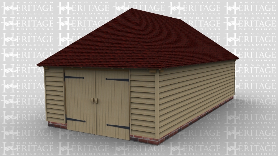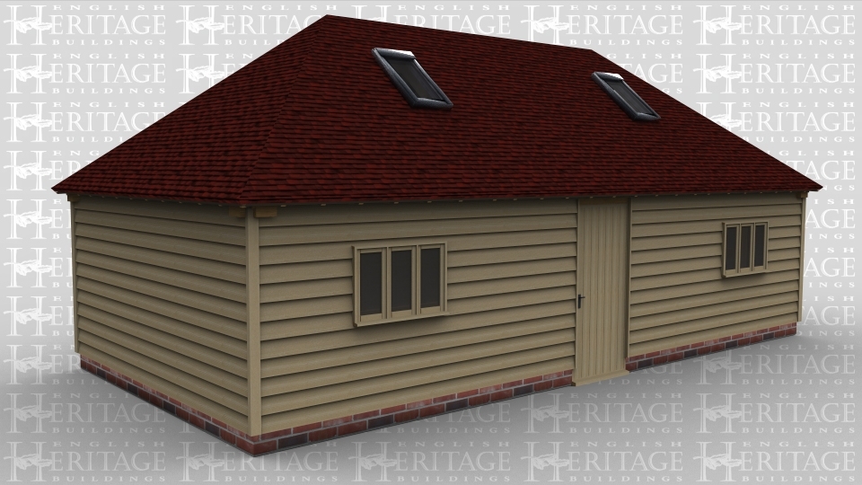 A 3 bay oak framed garage / workshop with two 3 light windows at the front as well as a single door while above there are 2 velux rooflights. On the right side of the building is a pair of garage doors.