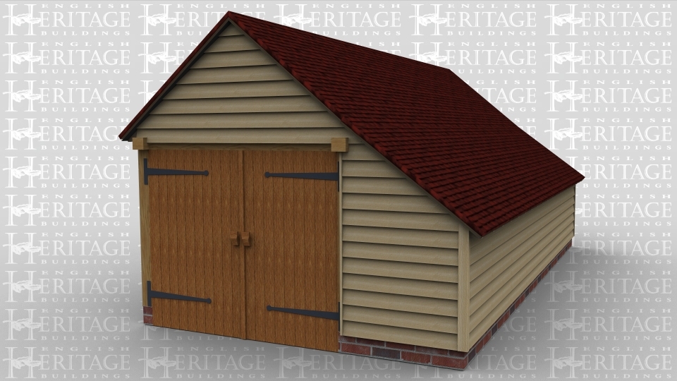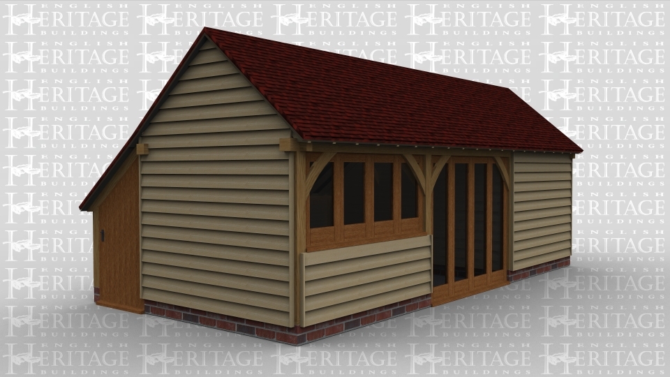 A3 bay oak framed leisure building with an internal aisle along the rear which has a door on the left hand side. On the right side of the building is a pair of garage doors while at the front is 4 panes of full height gazing as well as 4 pane window.