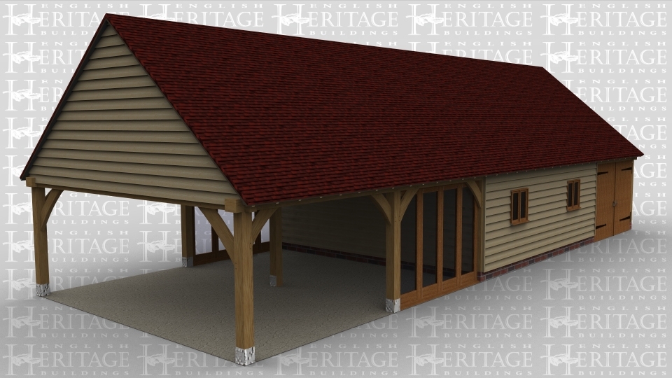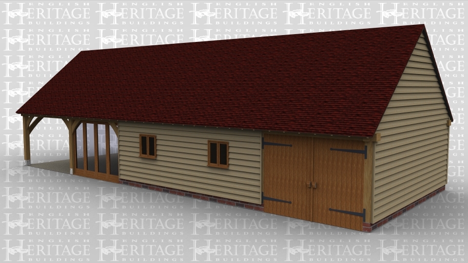 A 5 bay oak framed leisure building with the left hand bay ope on all sides, the next bay has full height glazing along the entire front and rear wall to allow plenty of natural light into the room. The next bay is boarded on the front, left and the rear with a 2 light window at the front and full height glazing on the rear wall.the next bay has a window with a further 4 panes at the rear and another 2 light window at the front, the final bay has a 2 light window at the rear and a pair of iroko garage doors at the front.