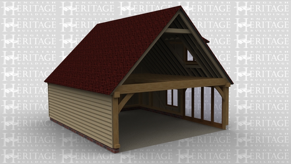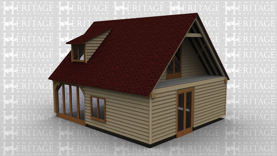 A 5 bay oak framed home extension with 3 of bays on the ground floor and 2 on the first floor. At the front of the building are 4 panes of full height glazing to allow plenty of natural light in, as well as a large 2 light window.ย On the right hand side is a pair of full height glazed doors and the left wall is left open to allow it to attach to an existing building. on the first floor there is a dormer with 2 windows in it.
