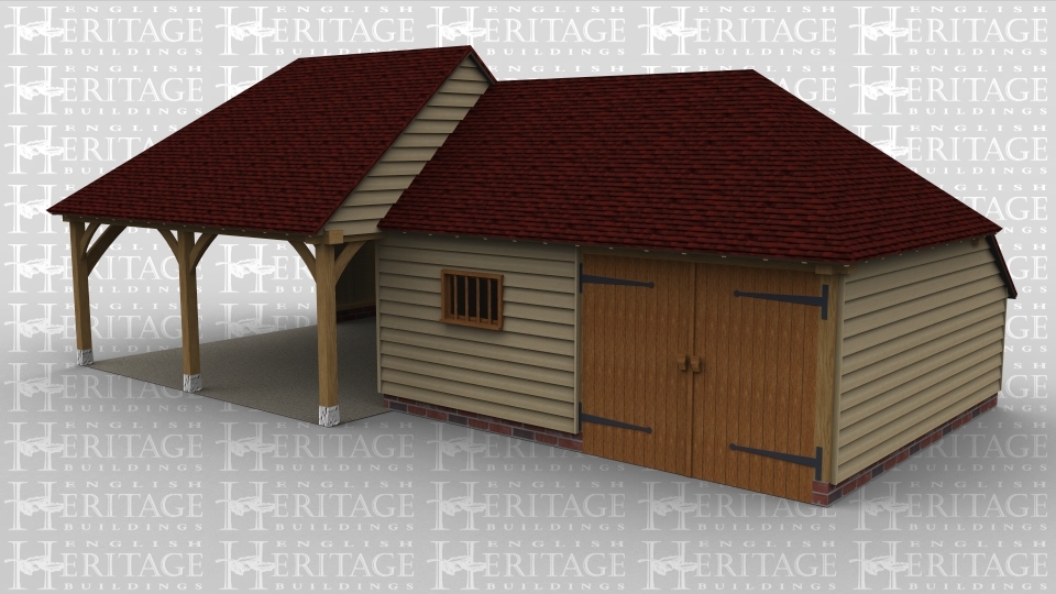 A 4 bay oak frame garage made up of 2 frames. The first frame accounts for the first 2 bays with the front left open and the left hand side only partially boarded, this frame also has an aisle at the rear. The second frame makes up the other 2 bays with 1 boarded at the front and housing a mullion window while the other has a pair of iroko garage doors at the front. On the left side is a solid single door connecting the 2 frames.