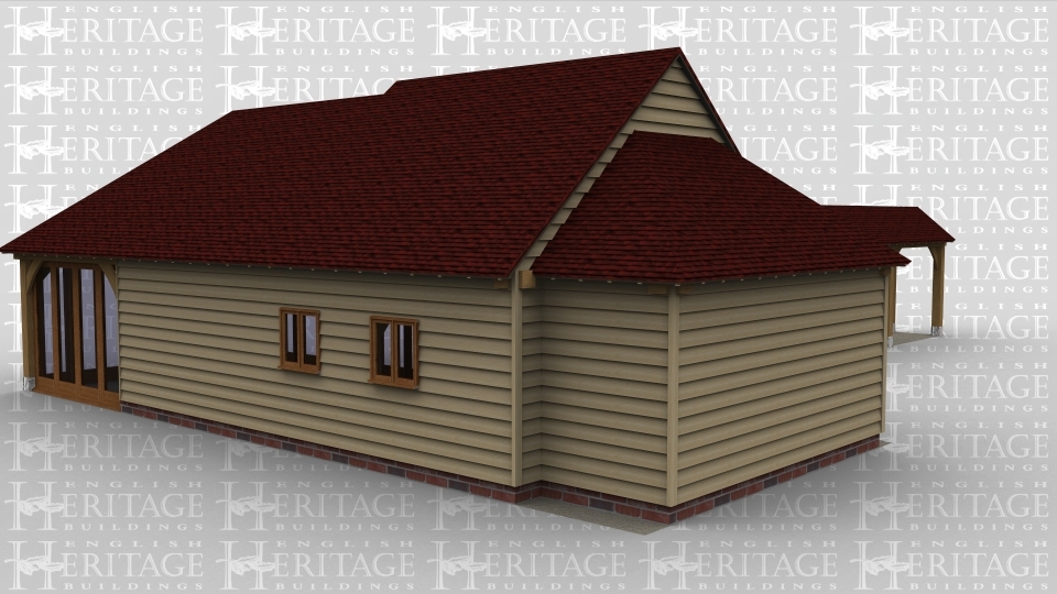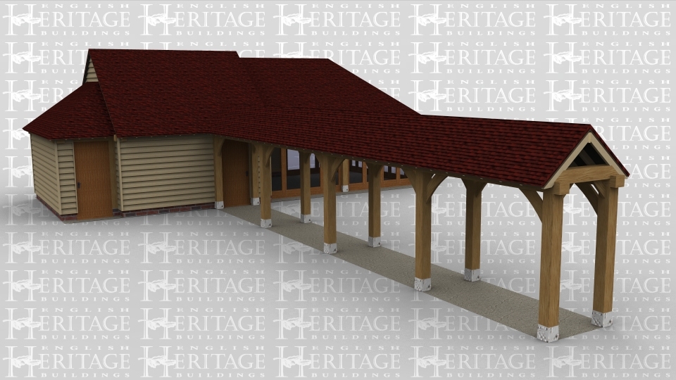 A 9 bay oak frame building made up of 4 frames. The first frame is 2 bays in size with the entire front wall filled with full height glazing as well as the right wall and part of the rear wall to allow plenty of natural light into the building. The second frame is also 2 bays in size with a solid single door at the front and 2 2light windows at the rear. The third frame is a single bay with just solid single door at the front. The final frame is 4 bays in size and is open on all sides.