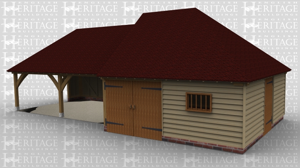 A 4 bay oak frame garage with the left wall open and 2 of the bays left open at the front, there is a pair of iroko garage doors at the front as well as a single mullion window and on the right is a solid single door.