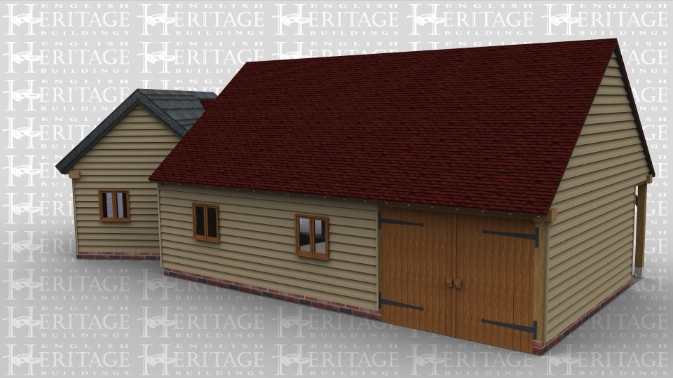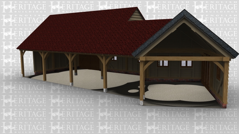 A 5 bay oak frame building made up of 2 frames, the first of which is 2 bays in size and left open on the left to allow it to attach to an existing building, the rear of the building has a 2 light window and a section of full height glazing to allow plenty of natural light in, the right wall has two 2 light windows and the frame has a thatch roof. The second frame is 3 bays in size and is open at the front and partially open on the left, at the rearthere are two 2 light windows and a pair of iroko garage doors