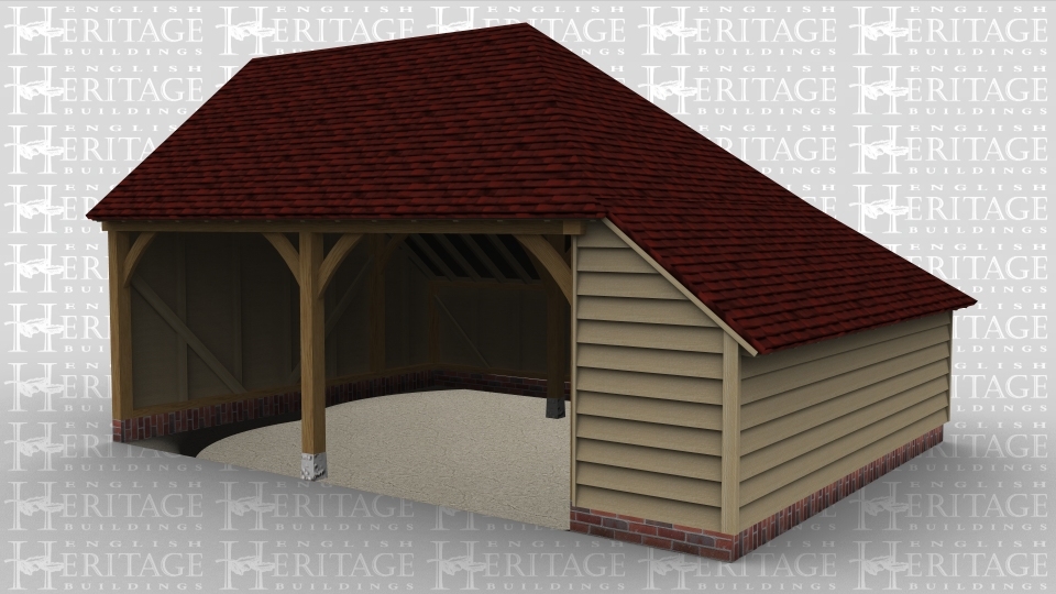 A two bay oak framed garage open at the front with an internal aisle on the right