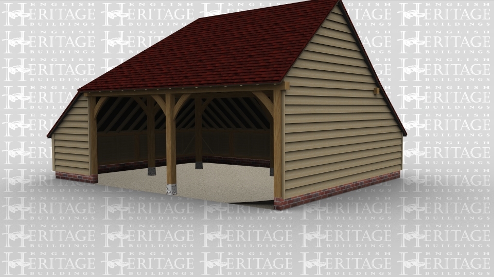 A 2 bay oak framed garage open at the front with an internal aisle on the left and rear.