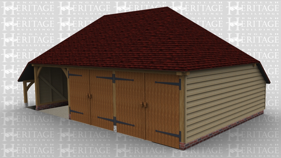 A 3 bay oak framed garage with 1 bay open at the front while the other two are enclosed with a pair of iroko garage doors at the front of each bay, there is also an external aisle on the left. and an internl aisle at the rear.