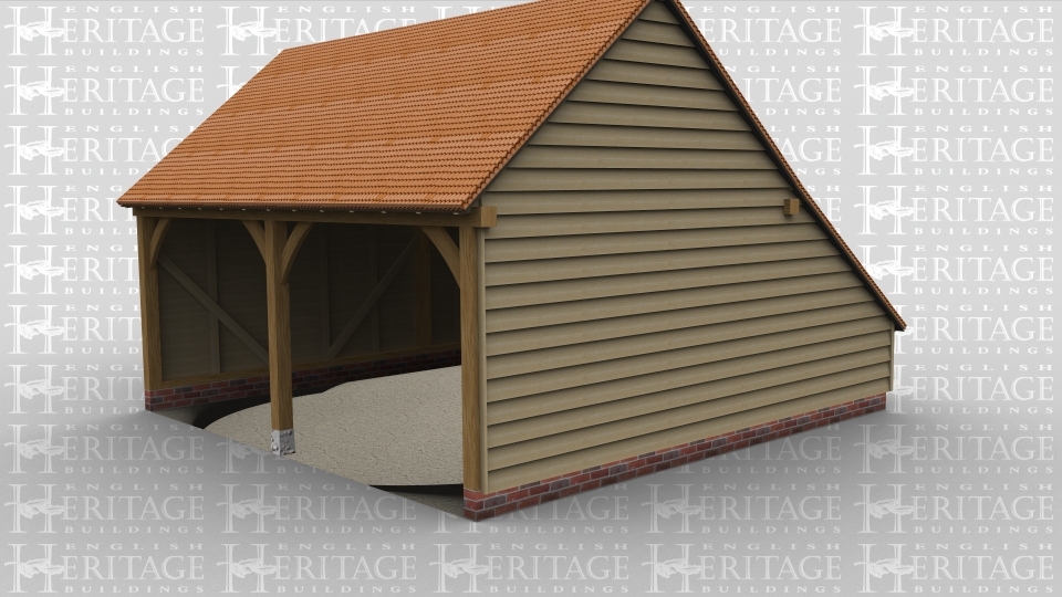 A 2 bay oak framed garage open at the front with an internal aisle at the rear and pantile roofing.