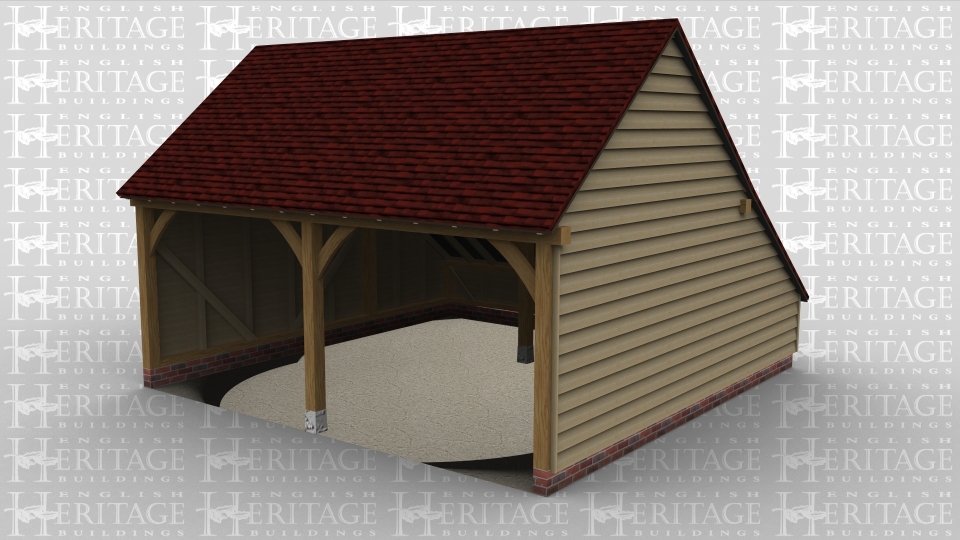 A 2 bay oak framed garage open at the front with an internal aisle at the rear.