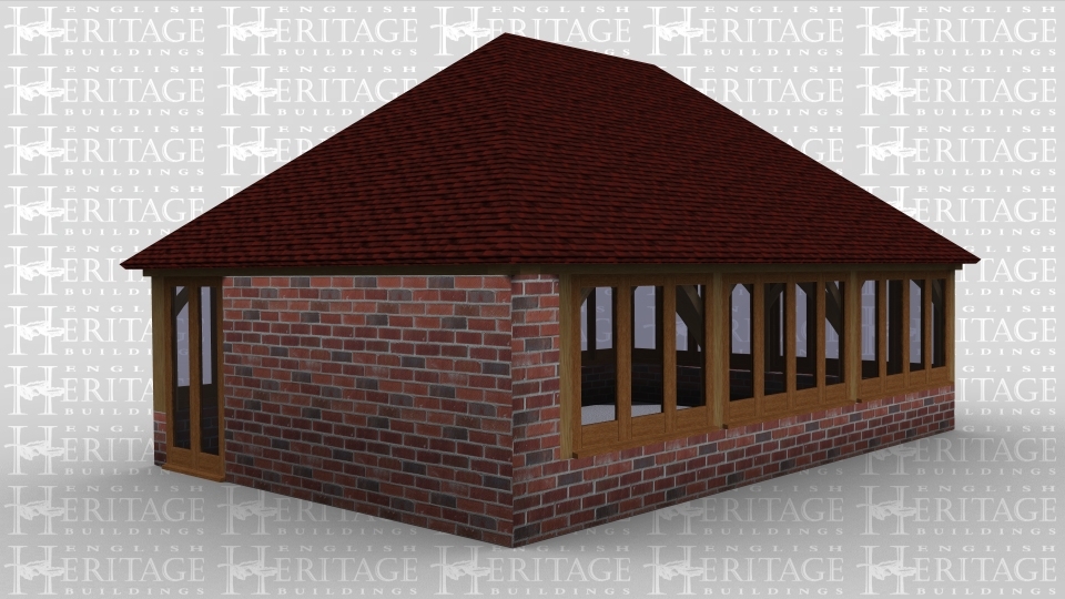 A 3 bay oak framed building with glazing along the front right and rear walls to allow plenty of natural light in, the building has brick walls and on the left is 2 full height glazed patio doors allow access to the building.