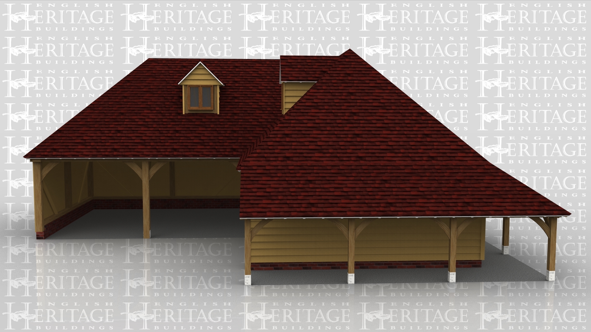 A 5 bay oak frame garage with upper floor configured in an ‘L’ shape. There is an external logstore to the right and rear of the right hand bay and two dormer windows in the upper floor. The upper floor is accessed via an intenral staircase.