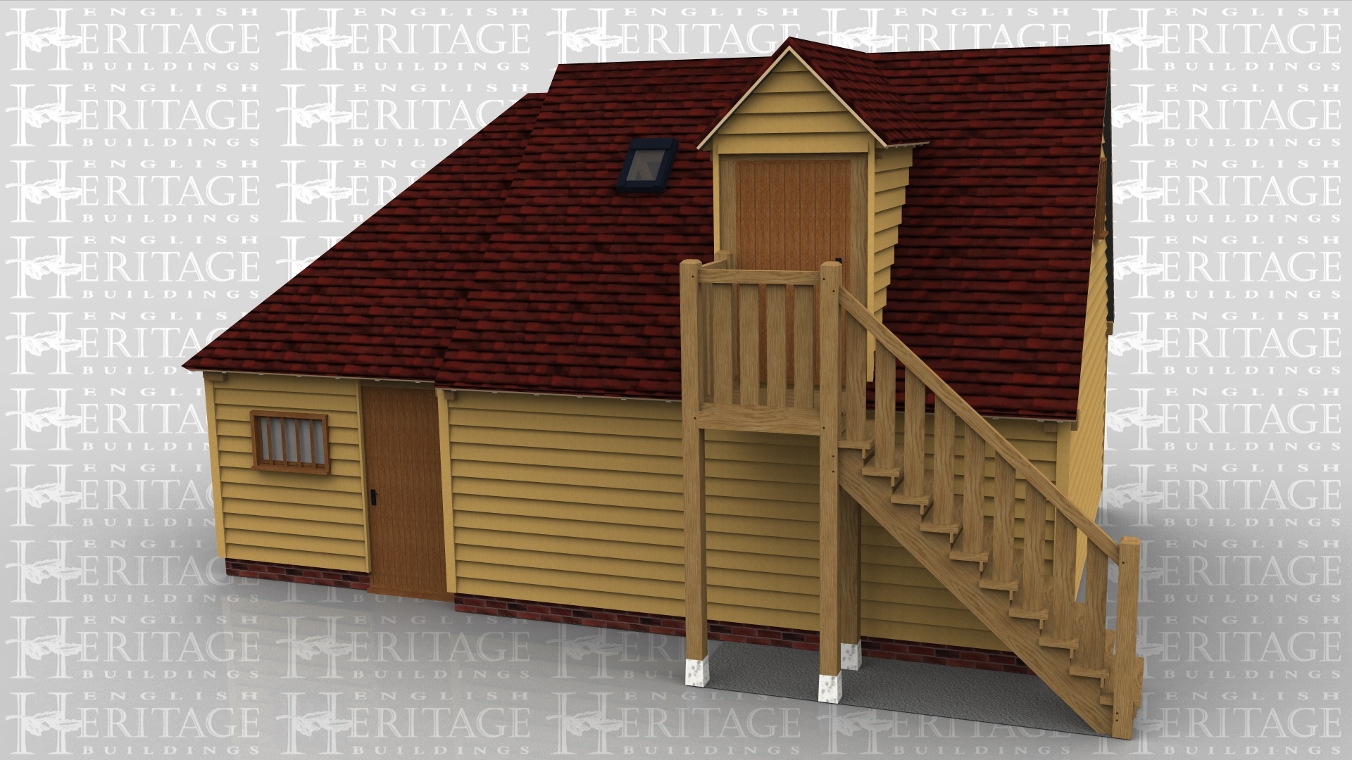A 3 bay oak frame building made up of 2 frames, the first of which is a single bay with a solid single door and a mullion window at the front and on the left is another mullion window. The second frame is 2 bayswith upper floor,the rear of the building is left open and at the front of the building is an external oak staircase allowing access to the first floor at the top of which is a solid single door housed in a large dormer, also on the first floor is a rooflight on the front to allow some natural light into the upper floor of the building.
