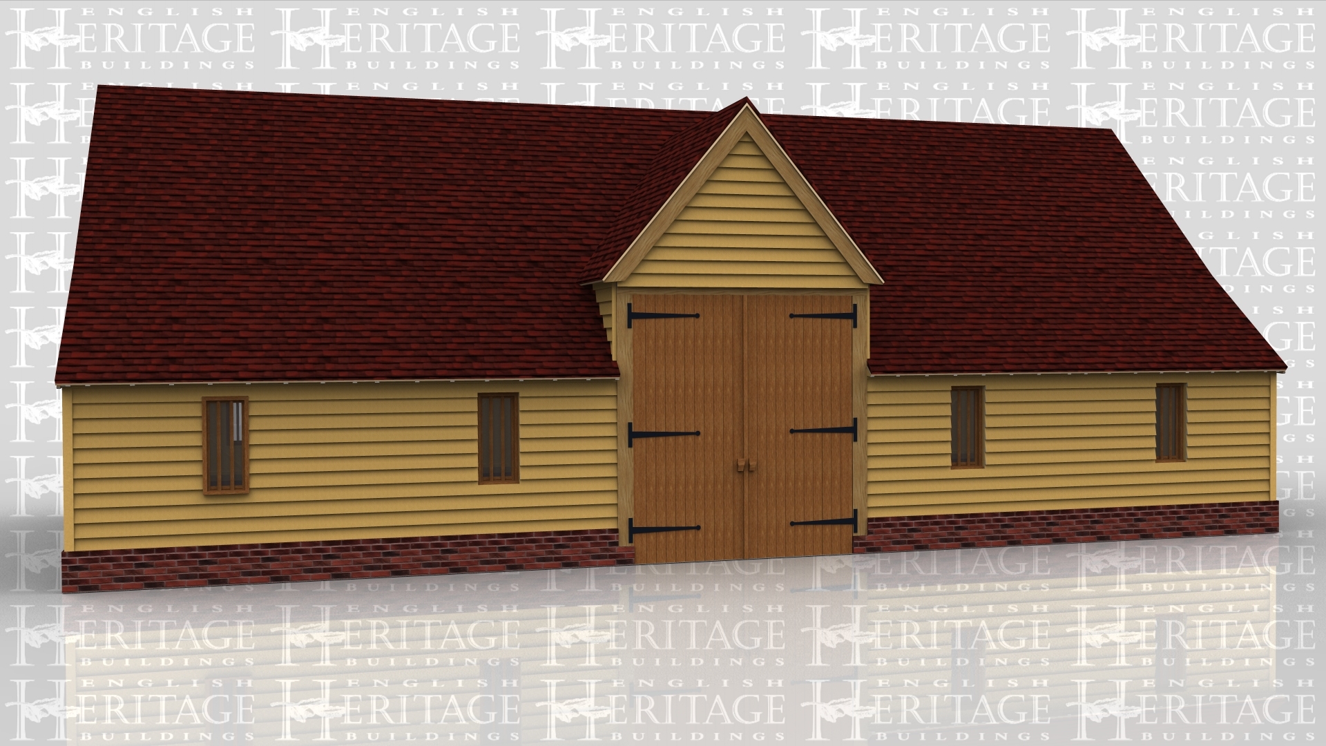 A 5 bay oak framed building with a pair of iroko barn doors housed within a barn entrance above at the front as well as 4 windows to allow plenty of natural light in, on the right side is another pair of iroko barn doors and on the left is a solid single door. The rear of the building has a window on each bay to allow plent of natural light into the building.