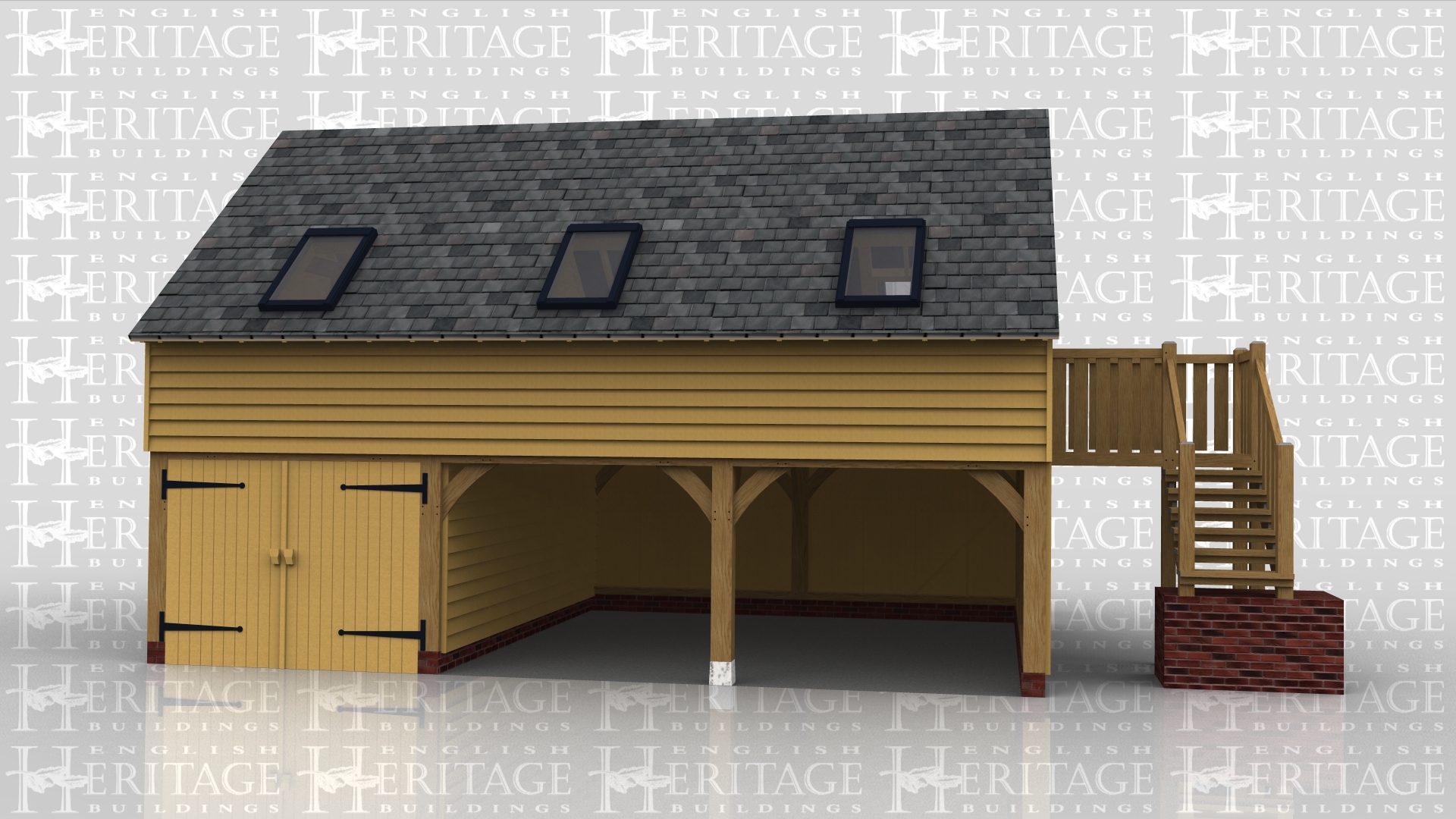 A 3 bay oak framed garage with upper floor. On the ground floor there is a pair of softwood garage doors at the front of 1 bay while the other 2 bays are open at the front. On the right of the building is an external staircase leading to the first floor. On ther first floor there is a half glazed single door on the right and at the front there are 3 rooflights as well as 3 more at the rear to allow plenty of natural light into the frame.