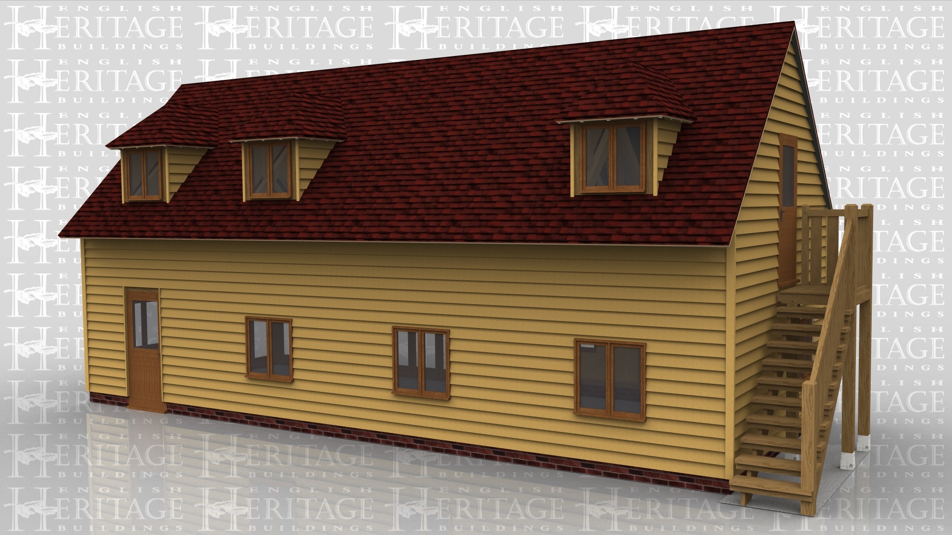 A 4 bay sling brace oak frame building with upper floor. On the ground floor at the front there are two 2 light windows each at the centre of the bay while the other 2 bays have the front wall made up entirely of full height glazing allowing plenty of natural light into the room. The right side of the building also has a section of full height glazing as well as a 2 light window. The rear of the building has a half glazed door and three 2 light windows while the left side has an external oak staircase allowing access to the first floor. On the first floor there is a half glazed door on the left and 3 dormers at the rear each containing a 2 light window. The front of the building also has 3 dormers containing a 2 light window each and the right side of the building has another 2 light window.