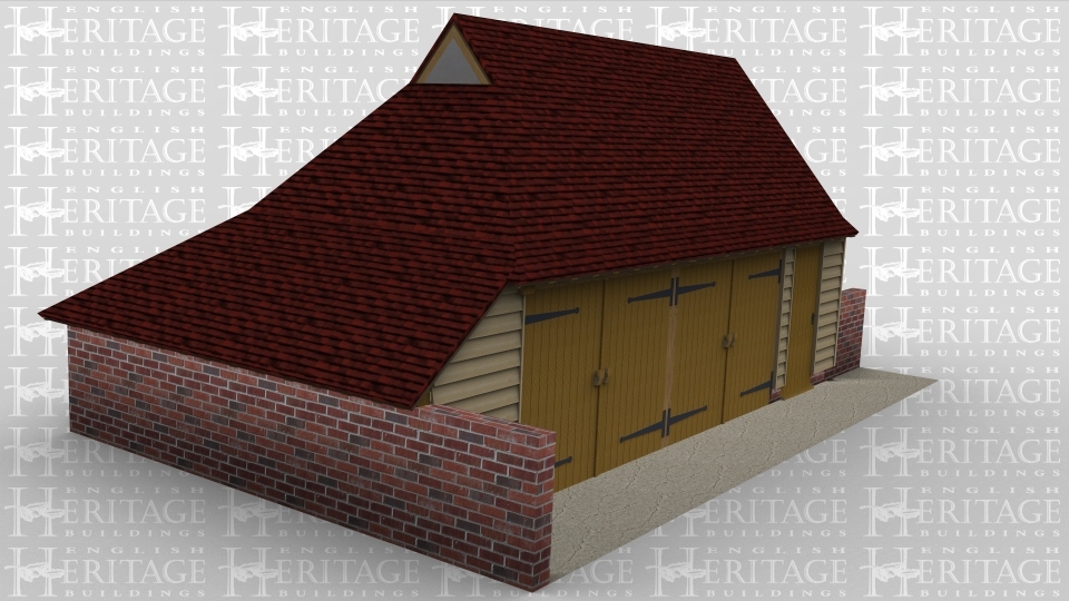 A 3 bay oak framed garage with 2 bays enclosed at the front with a pair of iroko garage doors while the third bay is weatherboarded with a solid single door, this building has a gablet roof on the left and gable end on the right while there is an internal aisle on both the rear and the left side.