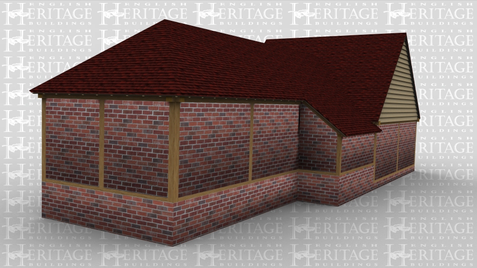 A 5 bay oak framed Complex made up of 2 frames, the first frame accounts for 2 of the bays with upper floor. On the ground floor the bays are enclosed at the front with a pair of iroko garage doors each, while the right hand wall is entirely brick, also on the right hand side is an external staircase leading to the first floor. On the first floor there is a solid single door on the right to allow access, also on the first floor there is a 2 light dormer window at the front of each bay to allow the natural light into the room. The second frame attaches to the rear of the first frame and is a 3 bay frame with extra high eaves for access for taller vehicles with 1 bay enclosed with a pair of hardwood barn doors and 2 further open bays with a full hip roof on the right.