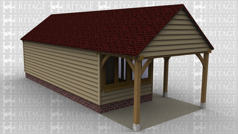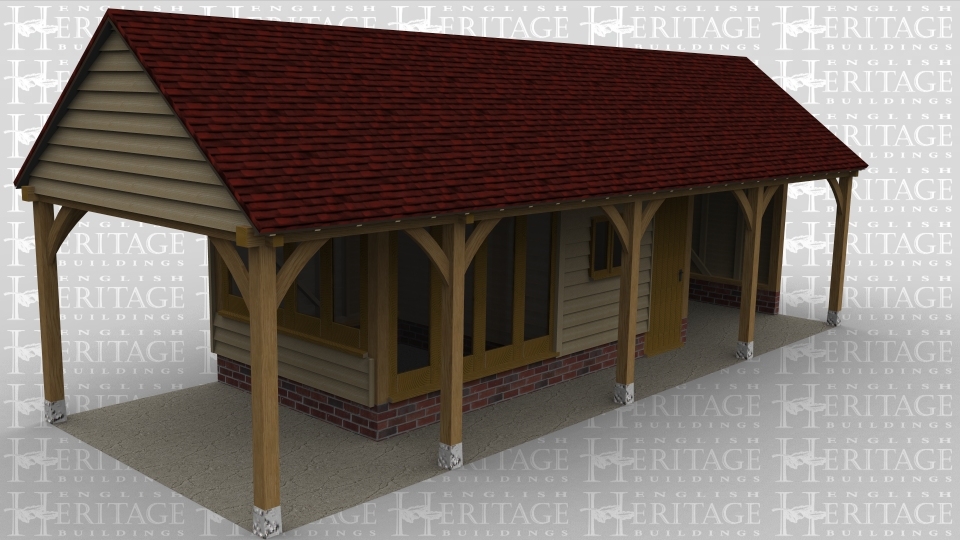 A 4 bay oak framed leisure building with a setback partition at the front, the first bay is open on all sides while the second bay is boarded at the rear with a section of garden rooms style glazing on the left as well as full height glazing across the front of the whole bay to allow plenty of natural light into the building. The third bay has a 2 light window at the front as well as a solid single door and the 4th bay is boarded on the right and at the rear but open at the front.