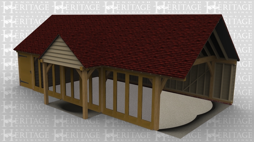 A 4 bay oak framed home extension with a large solid single door at the front as well as the other 3 bays covered entirely with full height glazing to allow plenty of natural light into the frame, the right side is left open to allow it to attach to an existing building and one of the bays has an open barn entrance at the front.