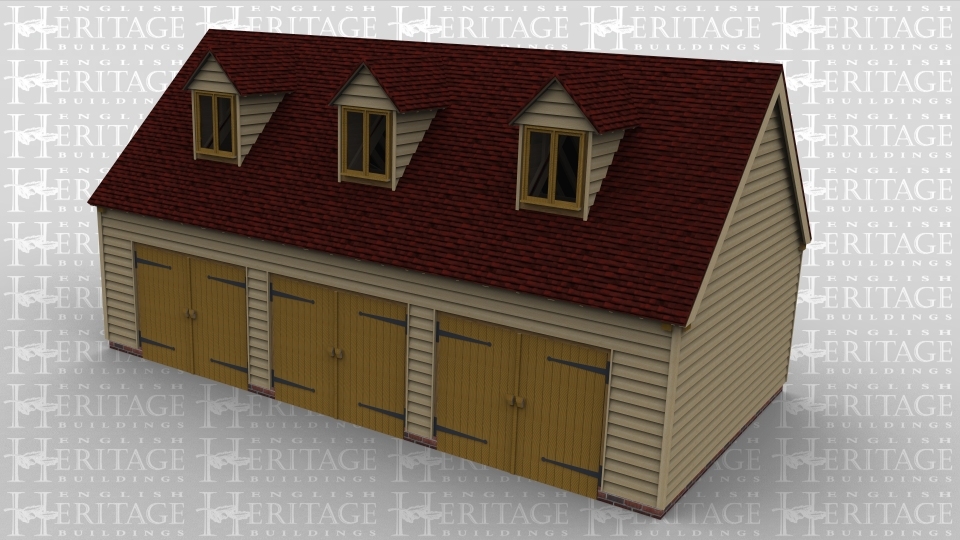 A oak framed garage with 3 bays on the ground floor and a further 3 bays on the first floor. On the first floor, each of the 3 bays is enclosed with a pair of iroko garage doors and at the read, there is a solid single door. On the first floor there is a 2 light dormer window at the front of each bay to allow plenty of light into the upper floor.