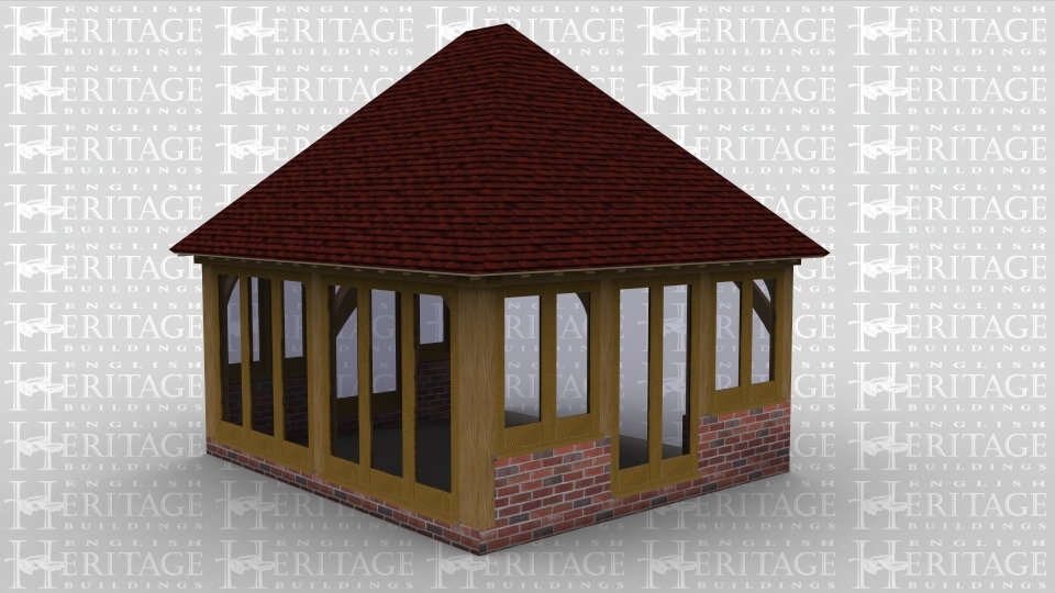 A 2 bay oak framed home extension with full height glazing along the entire front wall to allow plenty of natural light in while the rear is left open to allow it to attach to an existing building. The left wall has a pair of full hright iroko garden room doors and 2 smaller garden room windows either side and the same on the right, there are also 2 rooflights to allow even more natural light into the building.
