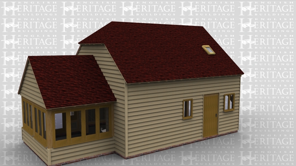 A 4 bay oak framed sling brace home extension with upper floor. The frame is open on the left to allow it to attach to an existing building and at the front is a pair of half glazed doors and a 4 light window. At the rear there is a solid single door and a 2 light window. On the first floor there are 2 dormer windows at the front and a velux rooflight at the rear to allow the natural light into the building. The right hand bay has a section of garden room windows along the right wall and at the front a pair of garden room doors with a smaller window either side while the rear has a further 4 panes of garden room windows to allow plenty of natural light into the building.