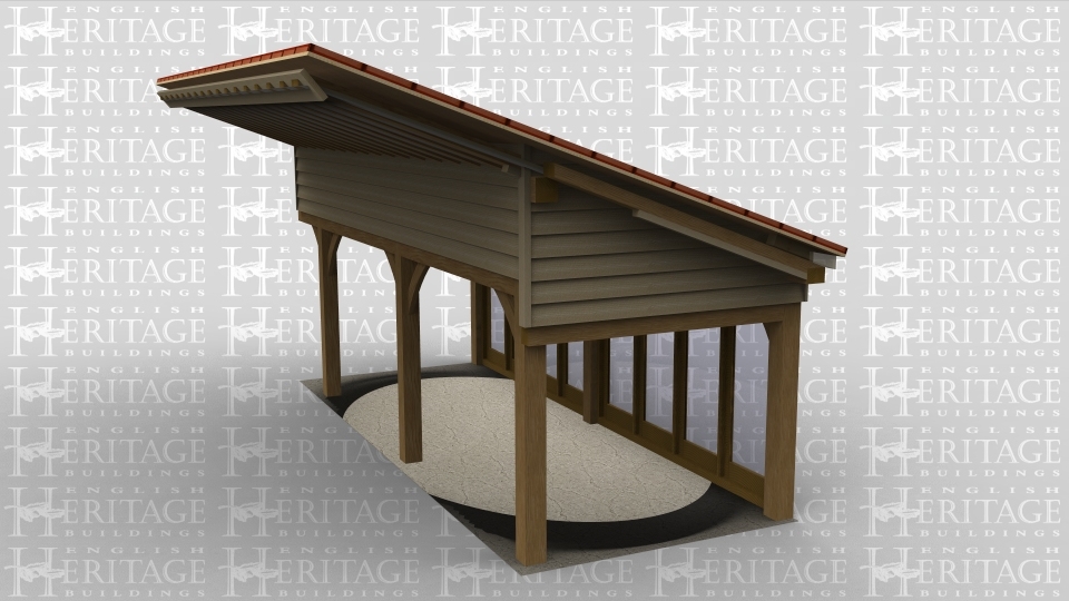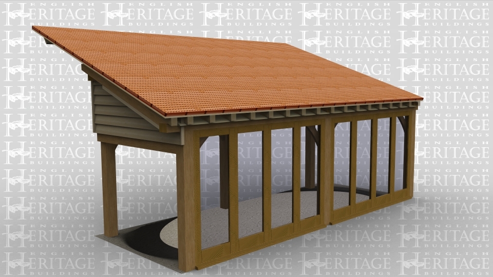 A 2 bay oak framed monopitch home extension with full height glazing along the whole of the front wall allowing plenty of natural light into the building with the rear wall left open to allow it to attach to an existing building.